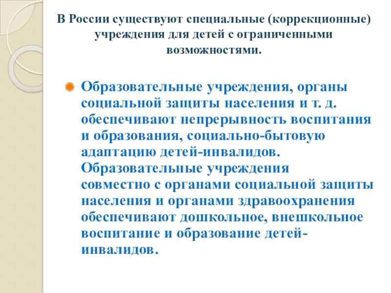 Слайд 16В России существуют специальные (коррекционные) учреждения для детей с ограниченными возможностями.