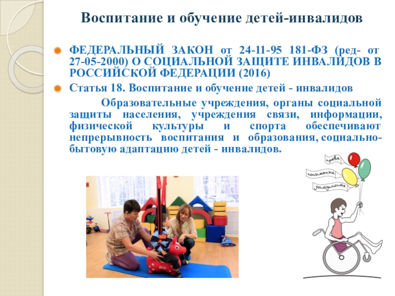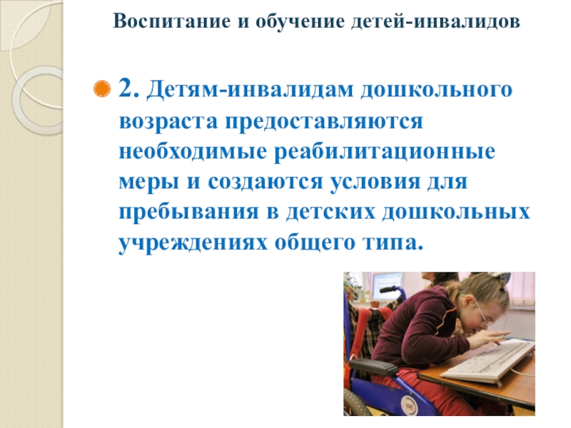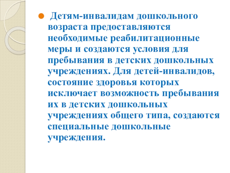 Слайд 17 Детям-инвалидам дошкольного возраста предоставляются необходимые реабилитационные меры и создаются условия для