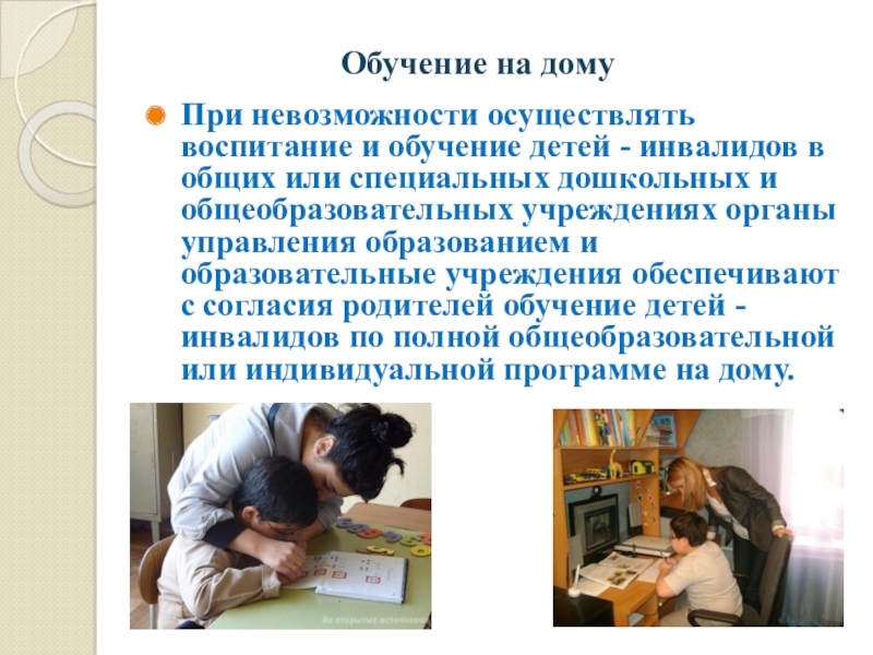 в общих или специальных дошкольных и общеобразовательных учреждениях органы управления образованием и образовательные учреждения обеспечивают с согласия родителей обучение детей-инвалидов по полной общеобразовательной или индивидуальной программе на дому.