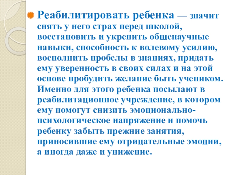 Слайд 6Реабилитировать ребенка — значит снять у него страх перед школой, восстановить