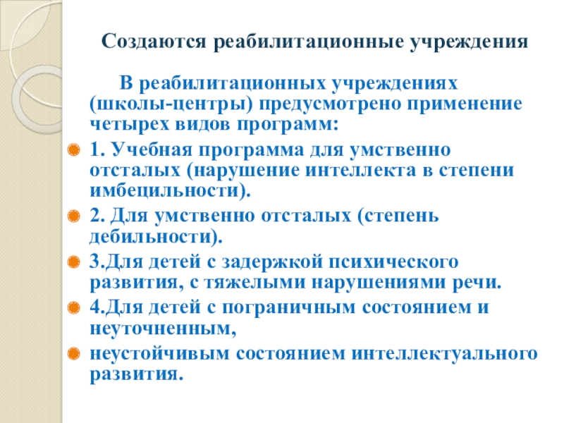 1. Учебная программа для умственно отсталых (нарушение интеллекта в степени имбецильности).
