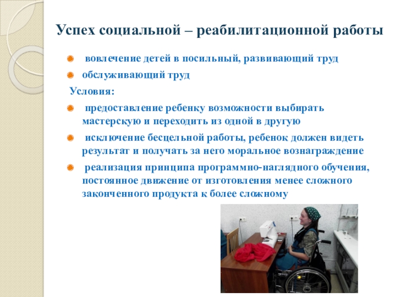 социальных мер, предупреждающих дальнейшее развитие болезни, потерю работоспособности и направленных на возможно более раннее и эффективное возвращение больных и инвалидов к общественно полезному труду и активной социальной жизни.