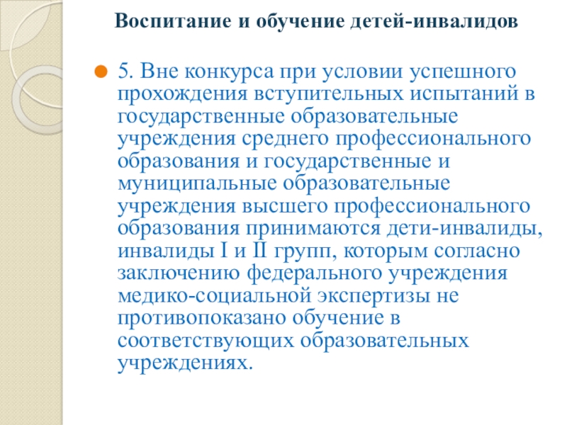испытаний в государственные образовательные учреждения среднего профессионального образования и государственные и муниципальные образовательные учреждения высшего профессионального образования принимаются дети-инвалиды, инвалиды I и II групп, которым согласно заключению федерального учреждения медико-социальной экспертизы не противопоказано обучение в соответствующих образовательных учреждениях.