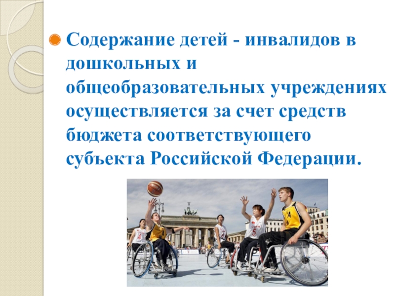 Слайд 23Содержание детей - инвалидов в дошкольных и общеобразовательных учреждениях осуществляется за