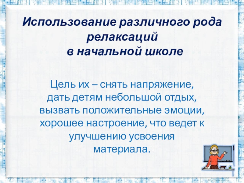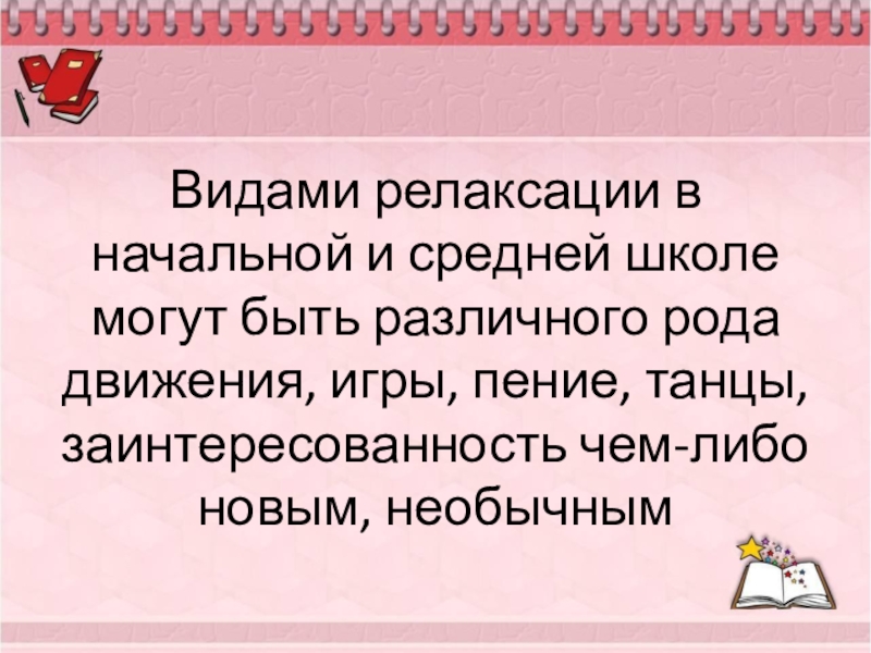 Слайд 12Видами релаксации в начальной и средней школе могут быть различного рода