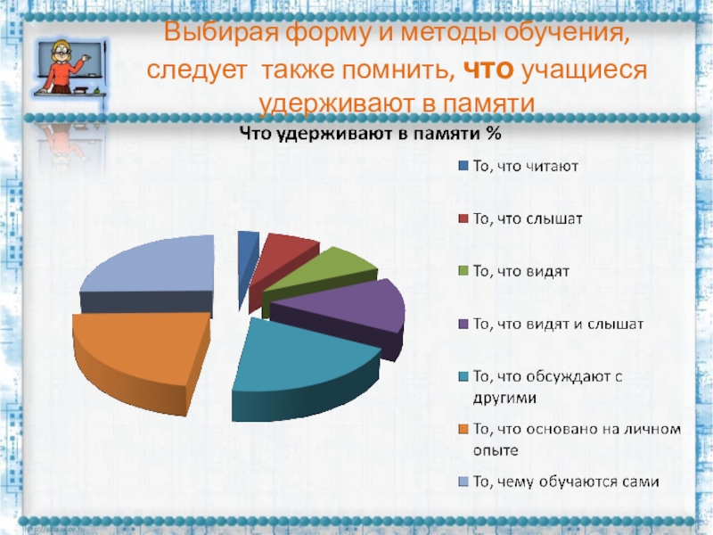 Слайд 13Выбирая форму и методы обучения, следует также помнить, что учащиеся удерживают