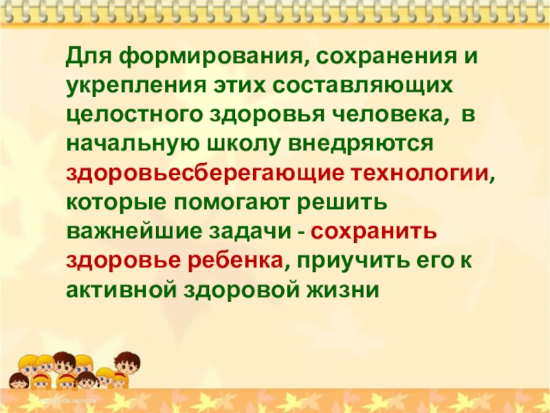 начальную школу внедряются здоровьесберегающие технологии, которые помогают решить важнейшие задачи - сохранить здоровье ребенка, приучить его к активной здоровой жизни