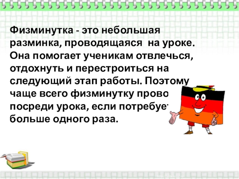 Физминутка - это небольшая разминка, проводящаяся на уроке. Она помогает ученикам отвлечься, отдохнуть