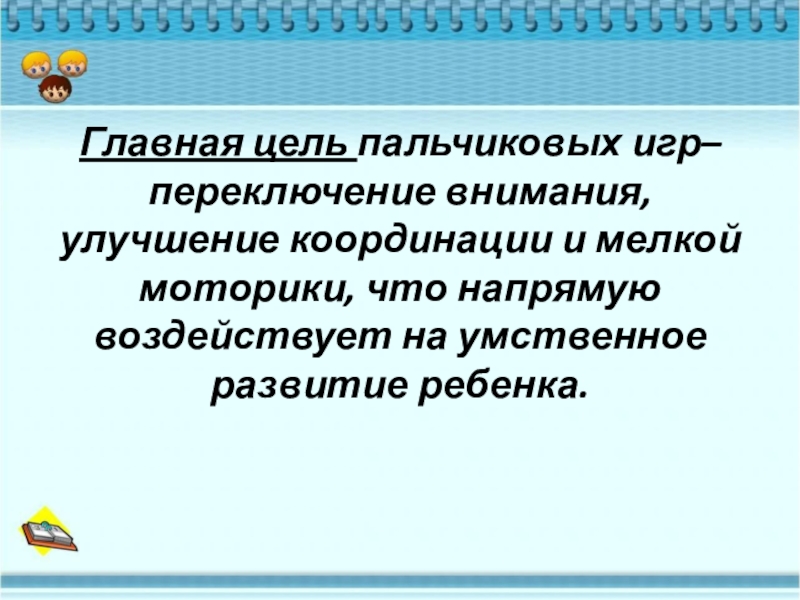 Слайд 18Главная цель пальчиковых игр– переключение внимания, улучшение координации и мелкой моторики,