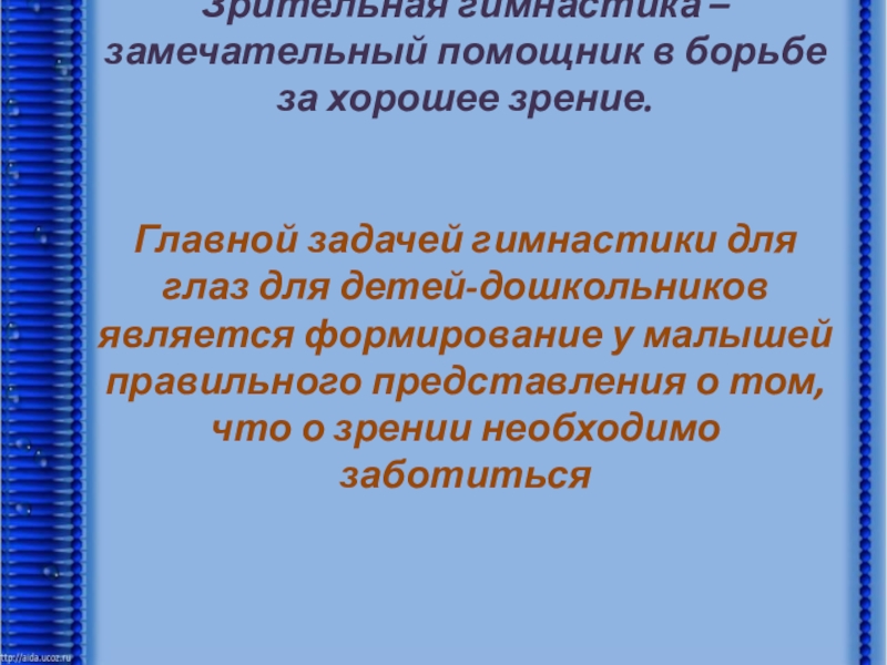 Слайд 23Зрительная гимнастика – замечательный помощник в борьбе за хорошее зрение.