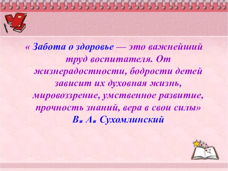 Слайд 26« Забота о здоровье — это важнейший труд воспитателя. От жизнерадостности,