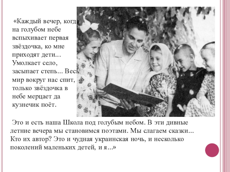 «Каждый вечер, когда на голубом небе вспыхивает первая звёздочка, ко мне приходят дети... Умолкает село, засыпает степь... Весь мир вокруг нас спит, только звёздочка в небе мерцает да кузнечик поёт.