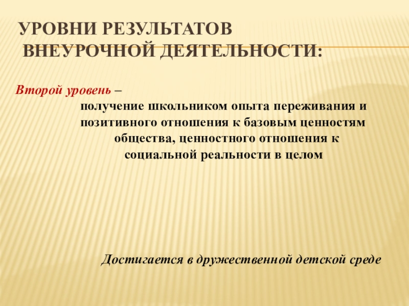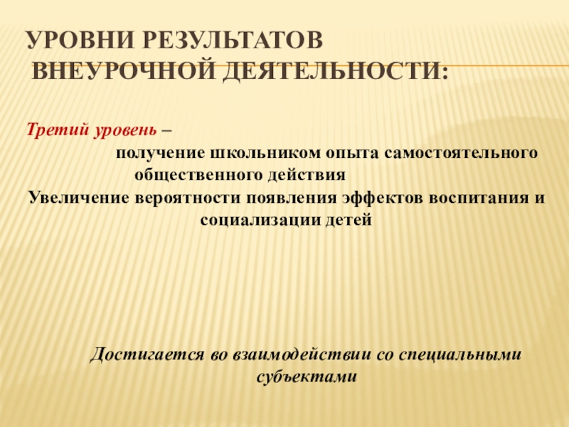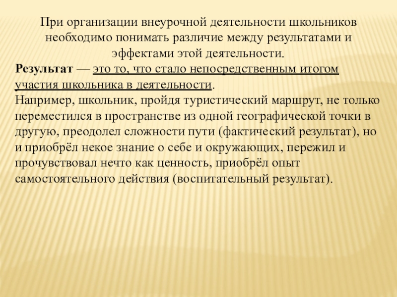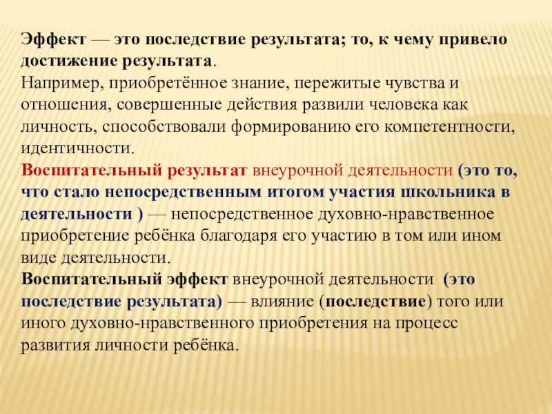 Воспитательный эффект внеурочной деятельности (это последствие результата) — влияние (последствие) того или иного духовно-нравственного приобретения на процесс развития личности ребёнка.