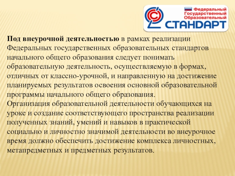 Слайд 10Под внеурочной деятельностью в рамках реализации Федеральных государственных образовательных стандартов начального общего