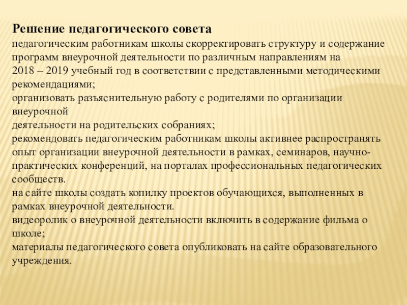 рекомендовать педагогическим работникам школы активнее распространять опыт организации внеурочной деятельности в рамках, семинаров, научно-практических конференций, на порталах профессиональных педагогических сообществ.