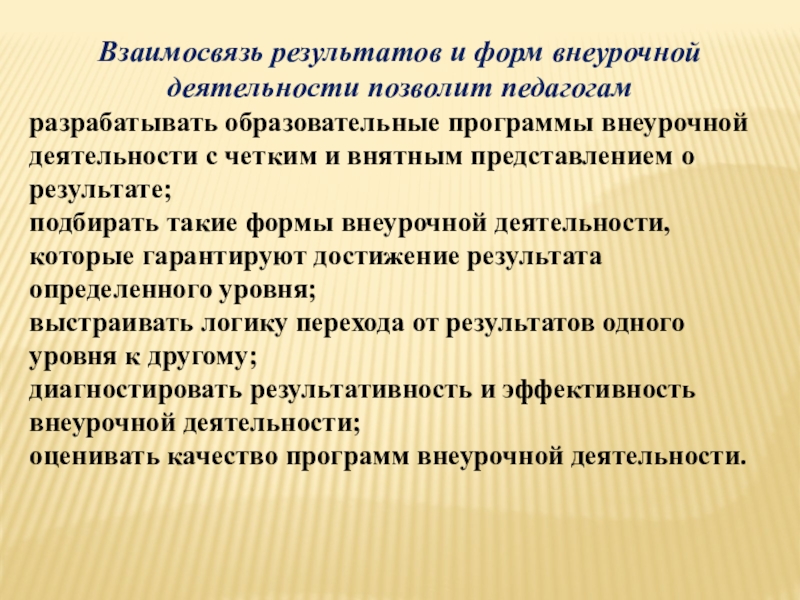 Слайд 32Взаимосвязь результатов и форм внеурочной деятельности позволит педагогам