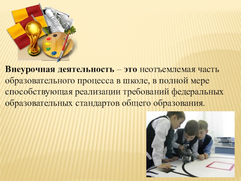 Слайд 6Внеурочная деятельность – это неотъемлемая часть образовательного процесса в школе, в полной мере способствующая