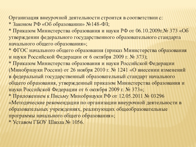 * Приложением к Письму Минобрнауки РФ от 12.05.2011 № 03296 «Методические рекомендации по организации внеурочной деятельности в образовательных учреждениях, реализующих общеобразовательные программы начального общего образования»;