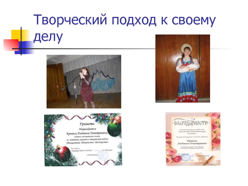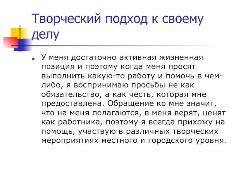 поэтому когда меня просят выполнить какую-то работу и помочь в чем-либо, я воспринимаю просьбы не как обязательство, а как честь, которая мне предоставлена. Обращение ко мне значит, что на меня полагаются, в меня верят, ценят как работника, поэтому я всегда прихожу на помощь, участвую в различных творческих мероприятиях местного и городского уровня.