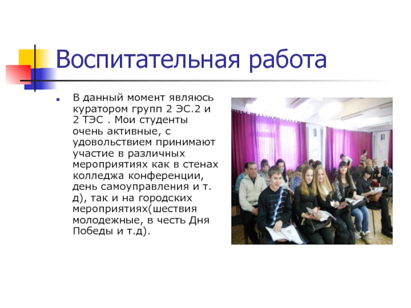 ТЭС . Мои студенты очень активные, с удовольствием принимают участие в различных мероприятиях как в стенах колледжа конференции, день самоуправления и т.д), так и на городских мероприятиях(шествия молодежные, в честь Дня Победы и т.д).