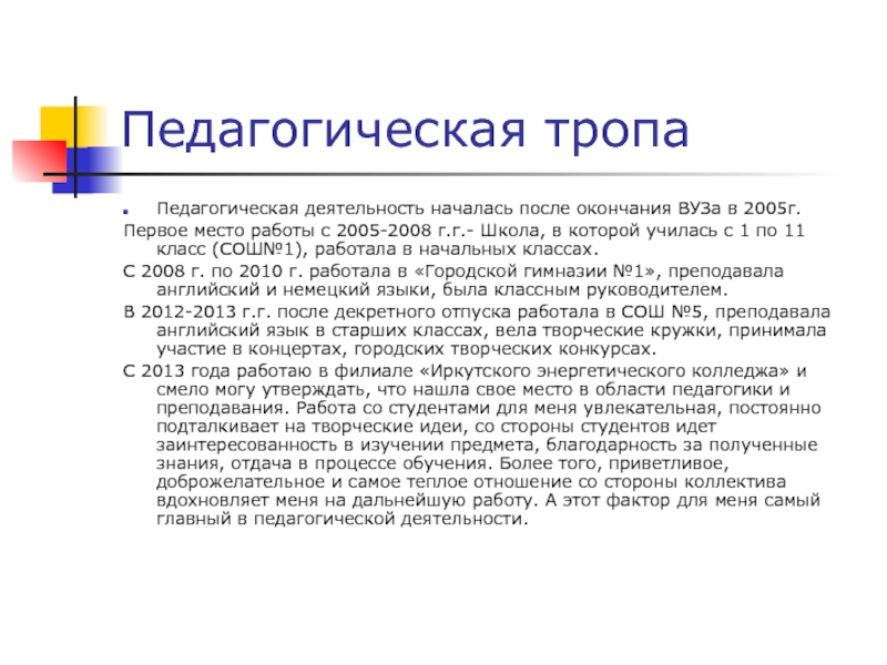С 2013 года работаю в филиале «Иркутского энергетического колледжа» и смело могу утверждать, что нашла свое место в области педагогики и преподавания. Работа со студентами для меня увлекательная, постоянно подталкивает на творческие идеи, со стороны студентов идет заинтересованность в изучении предмета, благодарность за полученные знания, отдача в процессе обучения. Более того, приветливое, доброжелательное и самое теплое отношение со стороны коллектива вдохновляет меня на дальнейшую работу. А этот фактор для меня самый главный в педагогической деятельности.