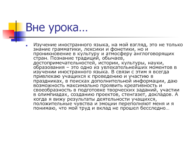 грамматики, лексики и фонетики, но и проникновение в культуру и атмосферу англоговорящих стран. Познание традиций, обычаев, достопримечательностей, истории, культуры, науки, образования – это одно из увлекательнейших моментов в изучении иностранного языка. В связи с этим я всегда привлекаю учащихся к проведению и участию в праздниках, в поисках дополнительной информации, даю возможность максимально проявить креативность и своеобразность в подготовке творческих заданий, участии в олимпиадах, созданию проектов, стенгазет, докладов. А когда я вижу результаты деятельности учащихся, положительные чувства и эмоции переполняют меня и я понимаю, что мой труд и вклад не прошел бесследно…