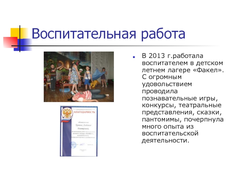 В 2013 г.работала воспитателем в детском летнем лагере «Факел». С