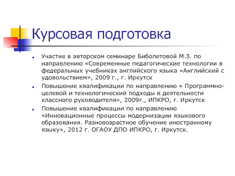 Повышение квалификации по направлению «Инновационные процессы модернизации языкового образования. Разновозрастное обучение иностранному языку», 2012 г. ОГАОУ ДПО ИПКРО, г. Иркутск.