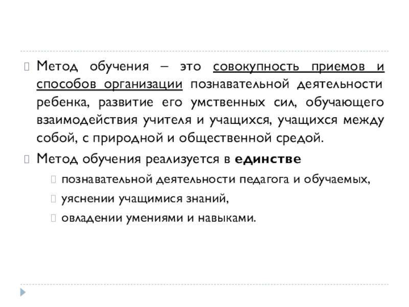 Слайд 19Метод обучения – это совокупность приемов и способов организации познавательной деятельности