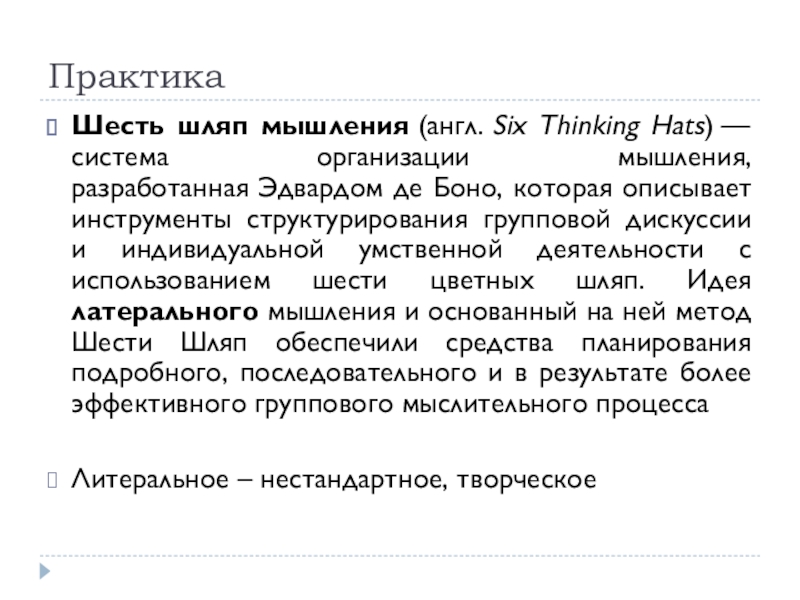 которая описывает инструменты структурирования групповой дискуссии и индивидуальной умственной деятельности с использованием шести цветных шляп. Идея латерального мышления и основанный на ней метод Шести Шляп обеспечили средства планирования подробного, последовательного и в результате более эффективного группового мыслительного процесса