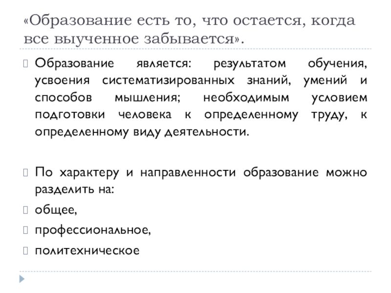 Слайд 9«Образование есть то, что остается, когда все выученное забывается».