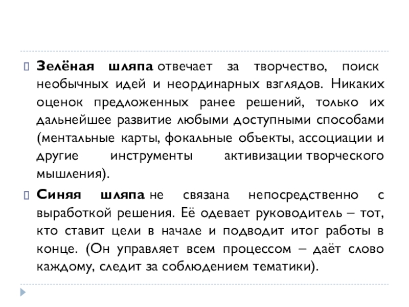 Слайд 33Зелёная шляпа отвечает за творчество, поиск необычных идей и неординарных взглядов. Никаких