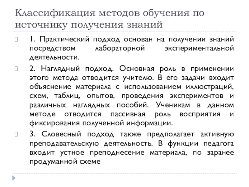 3. Словесный подход также предполагает активную преподавательскую деятельность. В функции педагога входит устное преподнесение материала, по заранее продуманной схеме