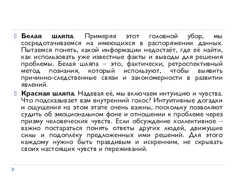 распоряжении данных. Пытаемся понять, какой информации недостаёт, где её найти, как использовать уже известные факты и выводы для решения проблемы. Белая шляпа – это, фактически, ретроспективный метод познания, который используют, чтобы выявить причинно-следственные связи и закономерности в развитии явлений.