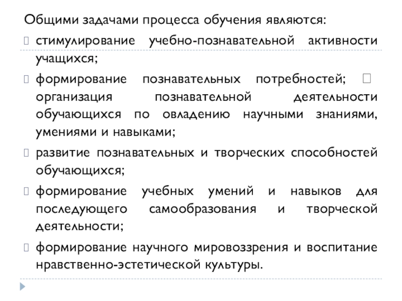 «Обучение – это процесс целенаправленный, управляемый», в котором «учитель излагает знания, дает задания, учит методам и приемам сознательного приобретения, закрепления и применения знаний, проверяет качество знаний, умений и навыков. При этом он постоянно заботится о развитии познавательных способностей школьников» (Б.П. Есипов).