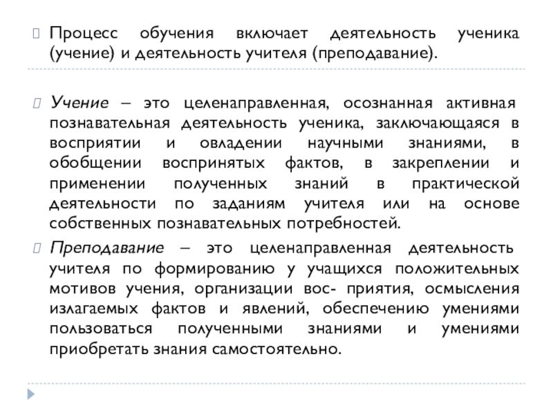 – это целенаправленная, осознанная активная познавательная деятельность ученика, заключающаяся в восприятии и овладении научными знаниями, в обобщении воспринятых фактов, в закреплении и применении полученных знаний в практической деятельности по заданиям учителя или на основе собственных познавательных потребностей.