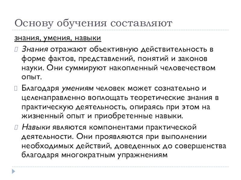 и учителей, благодаря которому обучаемый усваивает знания, умения, приобретает разнообразные навыки. В результате обучения у человека формируются определенное мировоззрение и мышление, развиваются умственные силы, потенциальные способности и возможности.