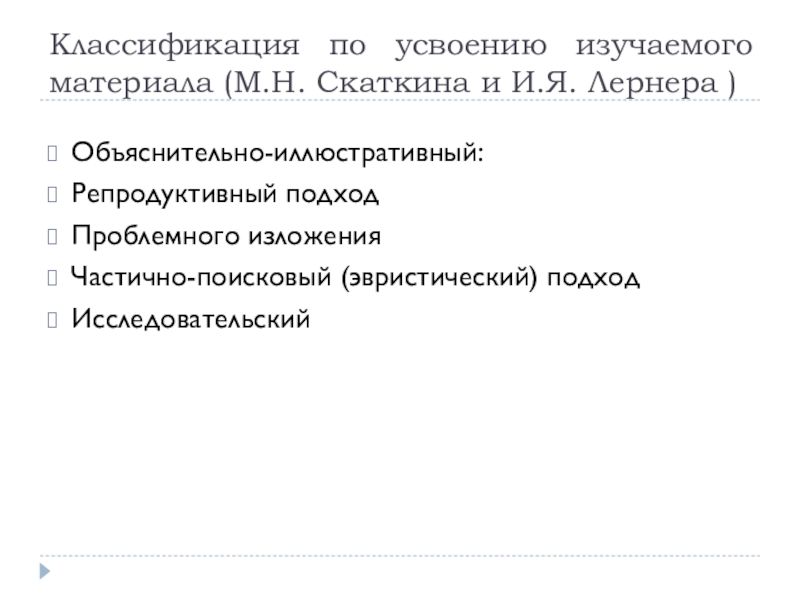 Слайд 22Классификация по усвоению изучаемого материала (М.Н. Скаткина и И.Я. Лернера )