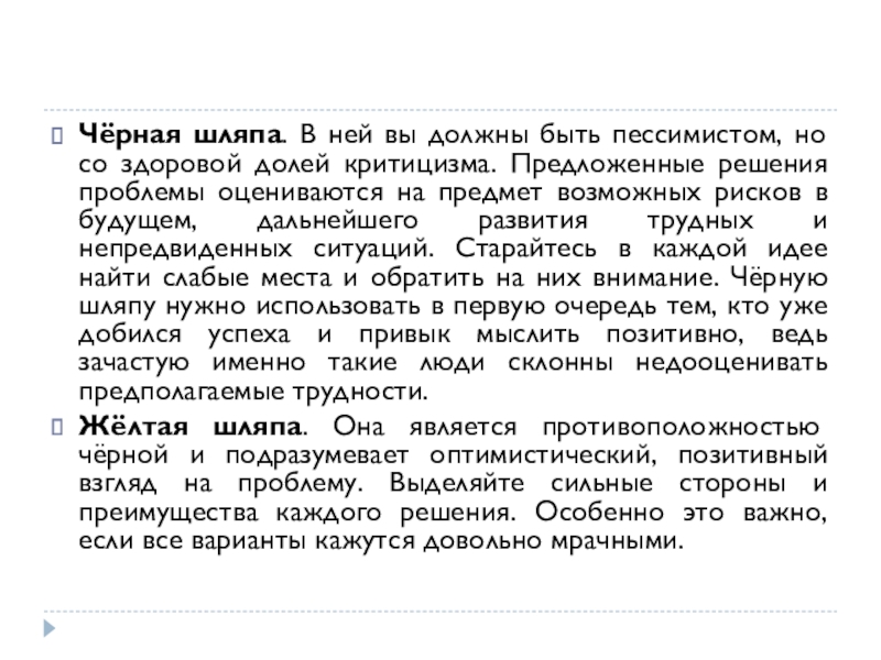 долей критицизма. Предложенные решения проблемы оцениваются на предмет возможных рисков в будущем, дальнейшего развития трудных и непредвиденных ситуаций. Старайтесь в каждой идее найти слабые места и обратить на них внимание. Чёрную шляпу нужно использовать в первую очередь тем, кто уже добился успеха и привык мыслить позитивно, ведь зачастую именно такие люди склонны недооценивать предполагаемые трудности.