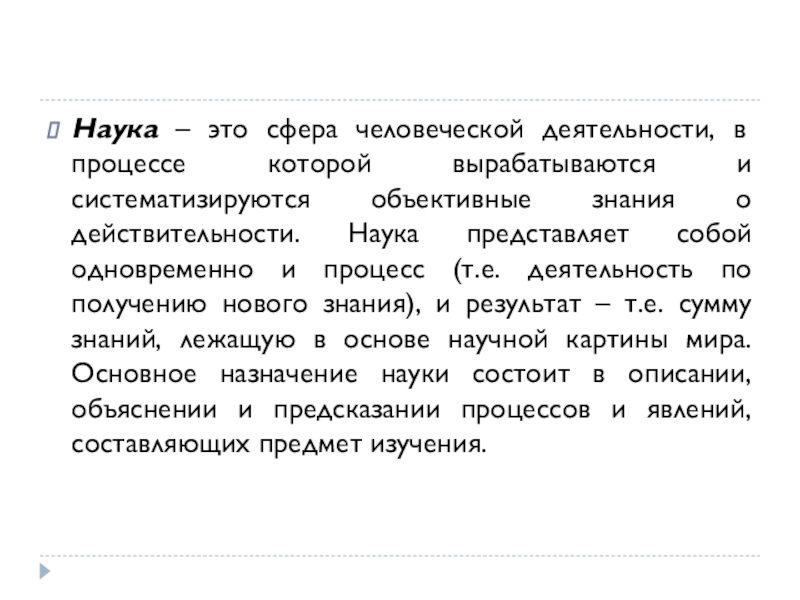 систематизируются объективные знания о действительности. Наука представляет собой одновременно и процесс (т.е. деятельность по получению нового знания), и результат – т.е. сумму знаний, лежащую в основе научной картины мира. Основное назначение науки состоит в описании, объяснении и предсказании процессов и явлений, составляющих предмет изучения.
