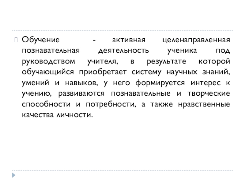 Слайд 14Обучение - активная целенаправленная познавательная деятельность ученика под руководством учителя, в