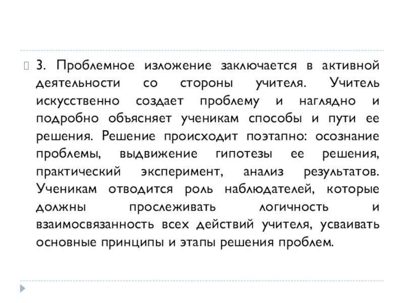 Слайд 243. Проблемное изложение заключается в активной деятельности со стороны учителя. Учитель