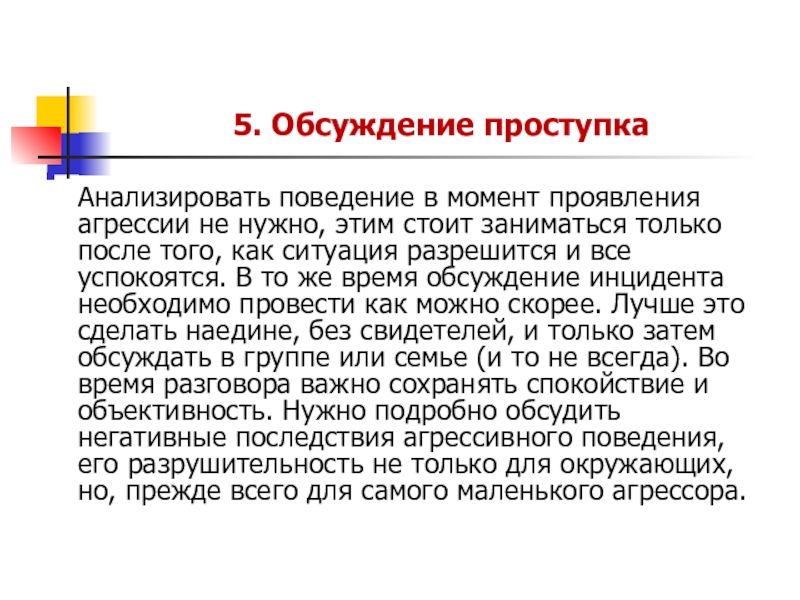 стоит заниматься только после того, как ситуация разрешится и все успокоятся. В то же время обсуждение инцидента необходимо провести как можно скорее. Лучше это сделать наедине, без свидетелей, и только затем обсуждать в группе или семье (и то не всегда). Во время разговора важно сохранять спокойствие и объективность. Нужно подробно обсудить негативные последствия агрессивного поведения, его разрушительность не только для окружающих, но, прежде всего для самого маленького агрессора.