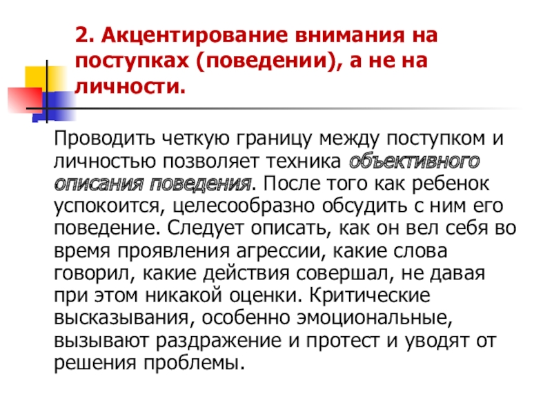 Слайд 162. Акцентирование внимания на поступках (поведении), а не на личности.