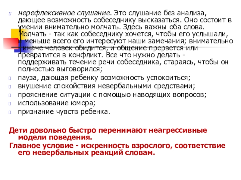 Слайд 22нерефлексивное слушание. Это слушание без анализа, дающее возможность собеседнику высказаться. Оно