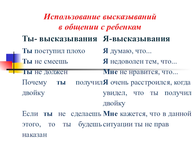 - обобщения типа: «Вы все одинаковые», «Ты, как всегда, ...», «Ты никогда не...»;