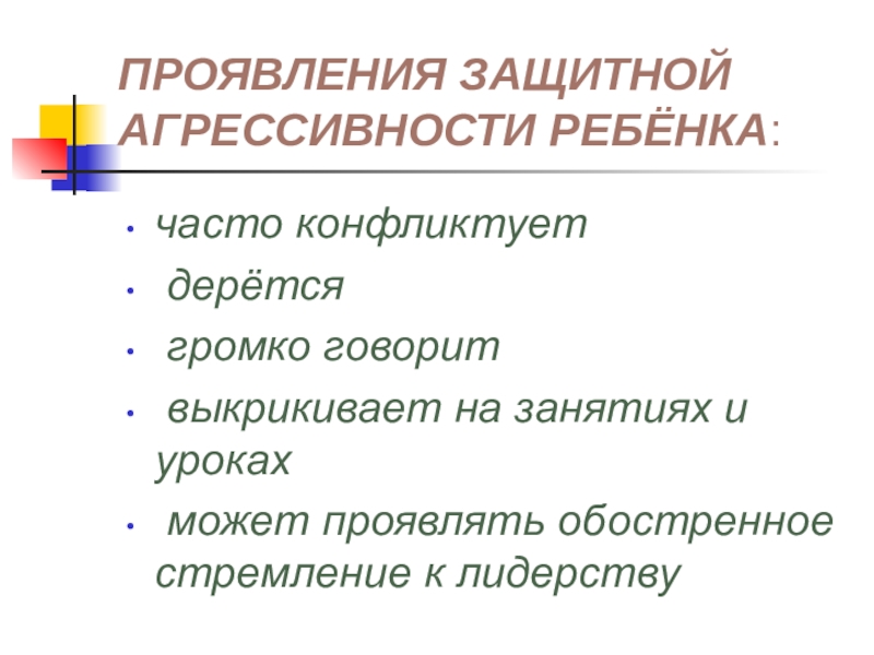 Слайд 7ПРОЯВЛЕНИЯ ЗАЩИТНОЙ АГРЕССИВНОСТИ РЕБЁНКА: