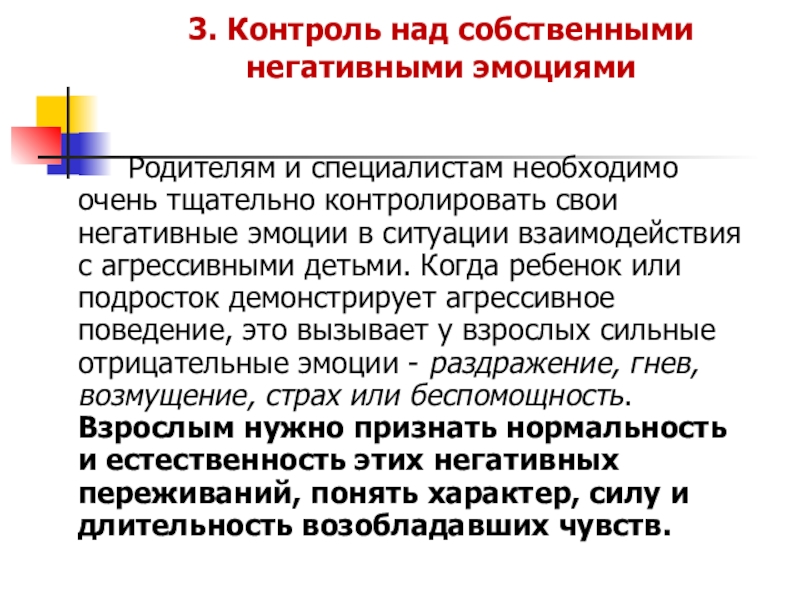 тщательно контролировать свои негативные эмоции в ситуации взаимодействия с агрессивными детьми. Когда ребенок или подросток демонстрирует агрессивное поведение, это вызывает у взрослых сильные отрицательные эмоции - раздражение, гнев, возмущение, страх или беспомощность. Взрослым нужно признать нормальность и естественность этих негативных переживаний, понять характер, силу и длительность возобладавших чувств.