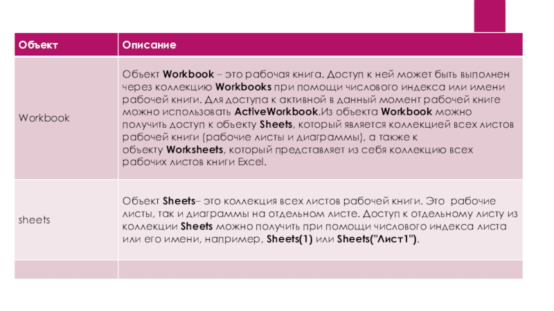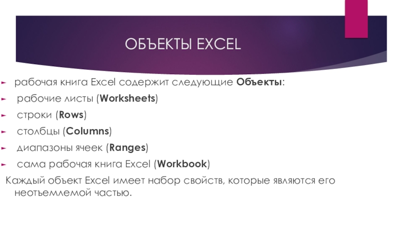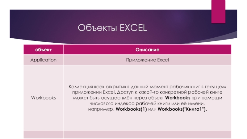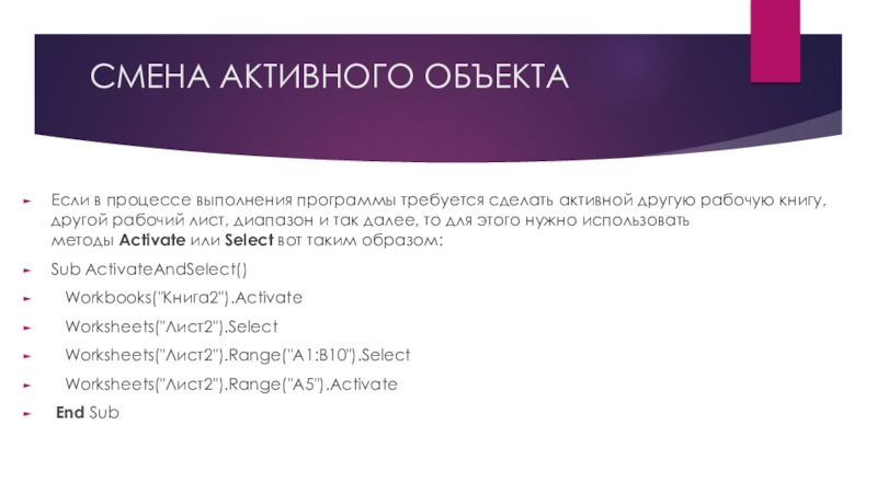 рабочая книга, открытая в этот момент. Точно так же существует активный объект Worksheet, активный объект Range и так далее.