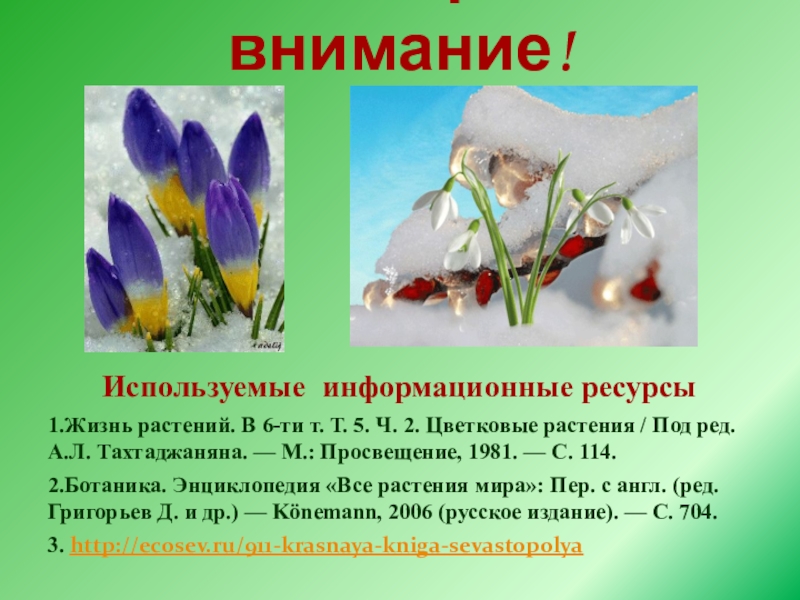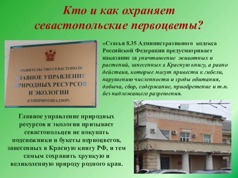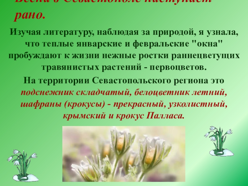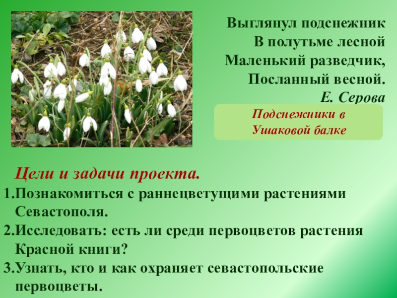 Главное управление природных ресурсов и экологии призывает севастопольцев не покупать подснежники и букеты первоцветов, занесенных в Красную книгу РФ, и тем самым сохранить хрупкую и великолепную природу родного края.